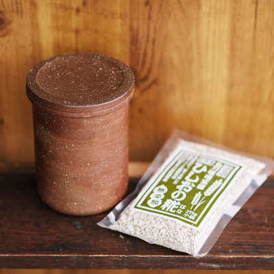 18,000円+税自家製ひしおづくりに最適な備前焼フードコンテナ(一陽窯)と「ひしおの糀」がセットになりました。