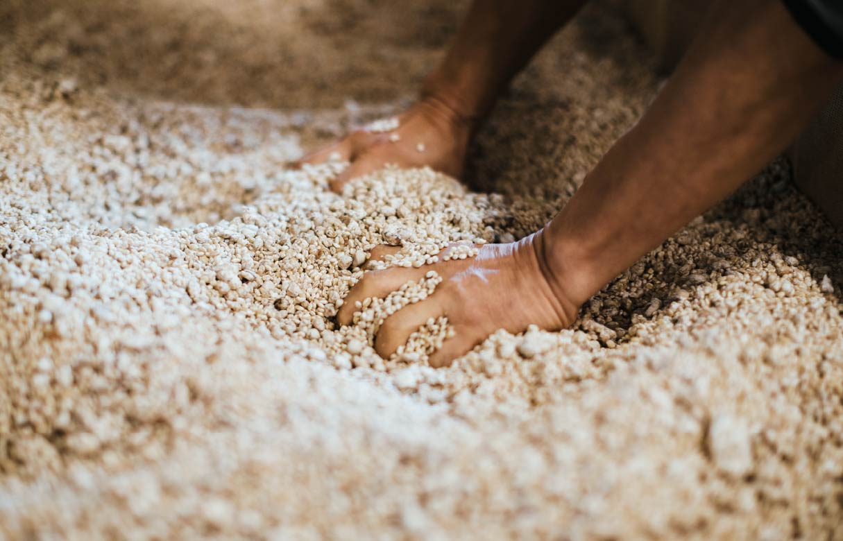 麹は放置すると発酵が進みすぎ、菌糸が絡み合い、自らが発する発酵熱によって弱ってしまいます。そのため、昼夜を問わず手を入れ、ほぐし、呼吸させる作業を続けます。素材の個性と向き合いながら、焦らず、急がずじっくりと。麹造りは子育てにも似ています。