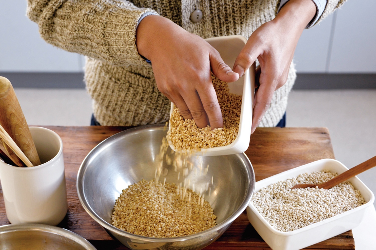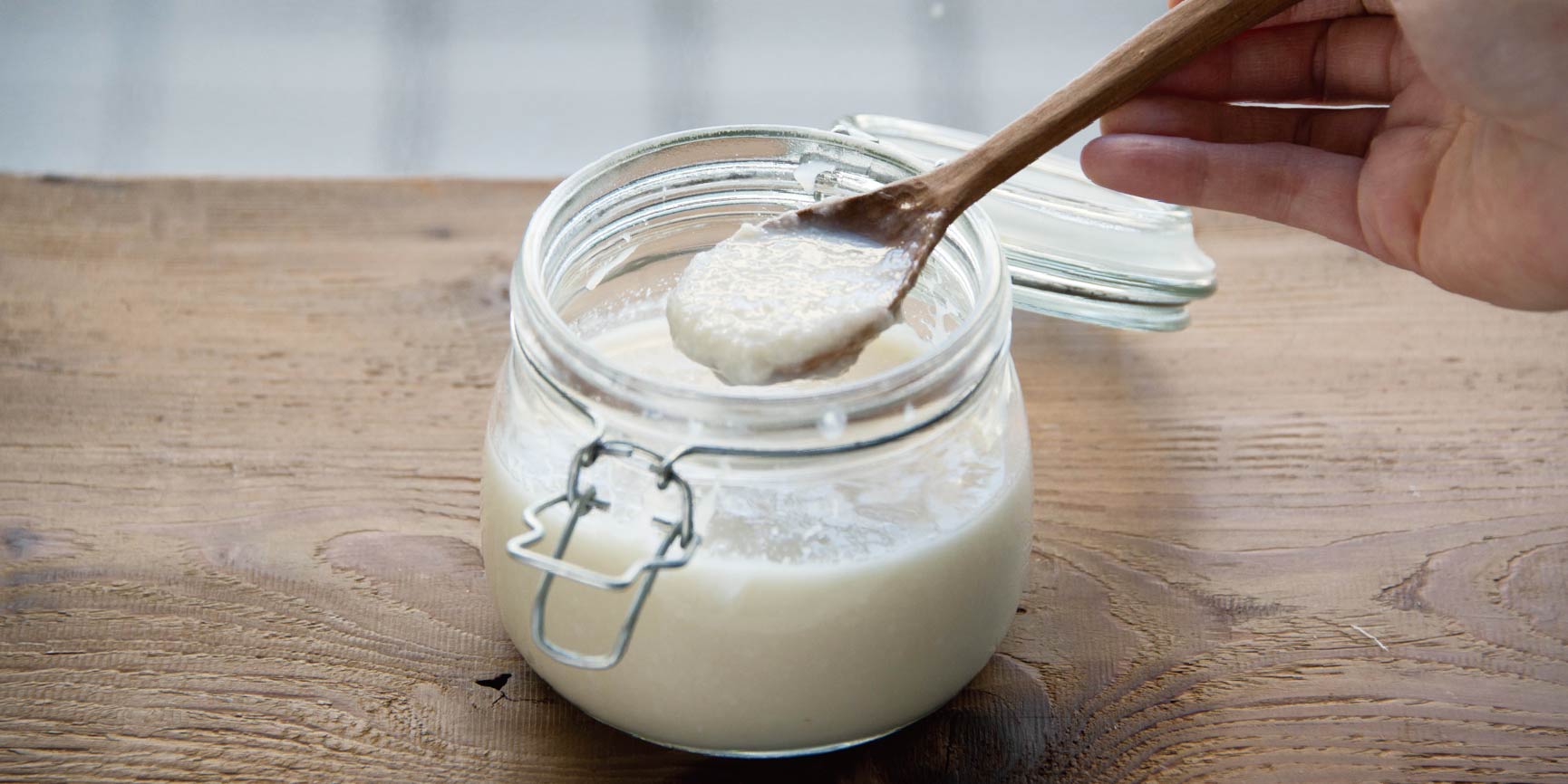 水分が乳白色になり、麹がちょうど浸かるくらいまでの量になったら、清潔な容器に移し替える。容器は密封せず、フタを緩めておくか、ラップを軽くかけておく。