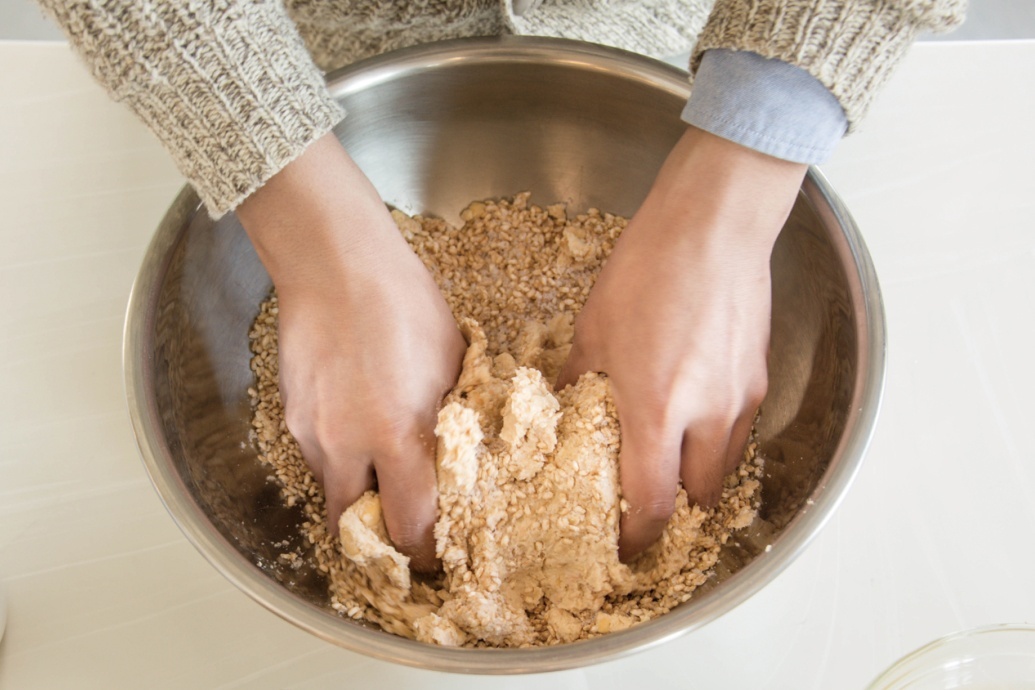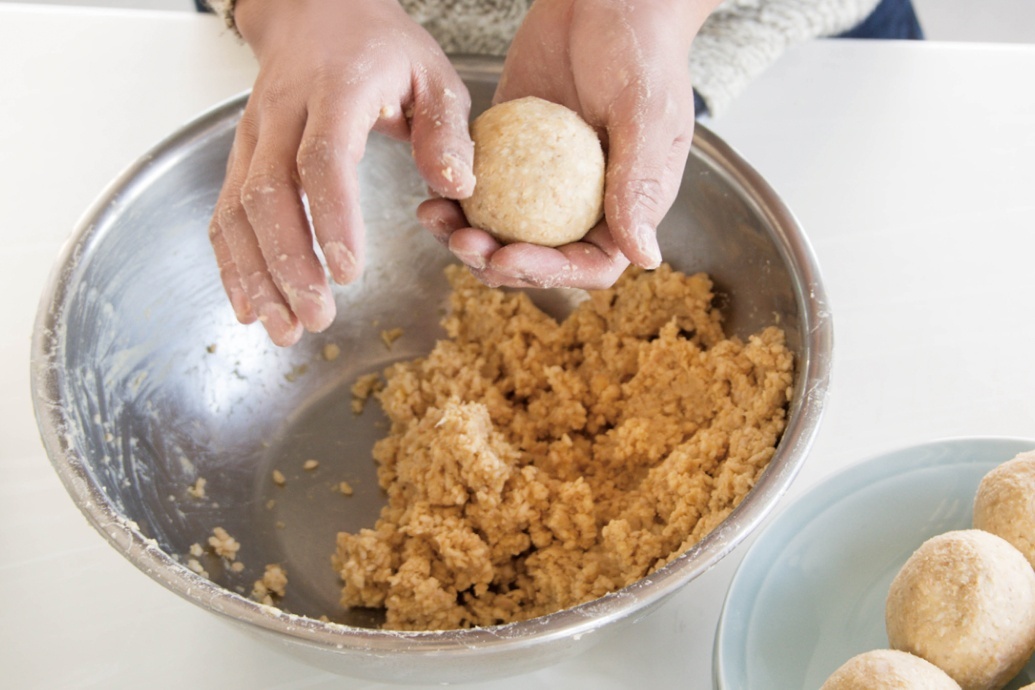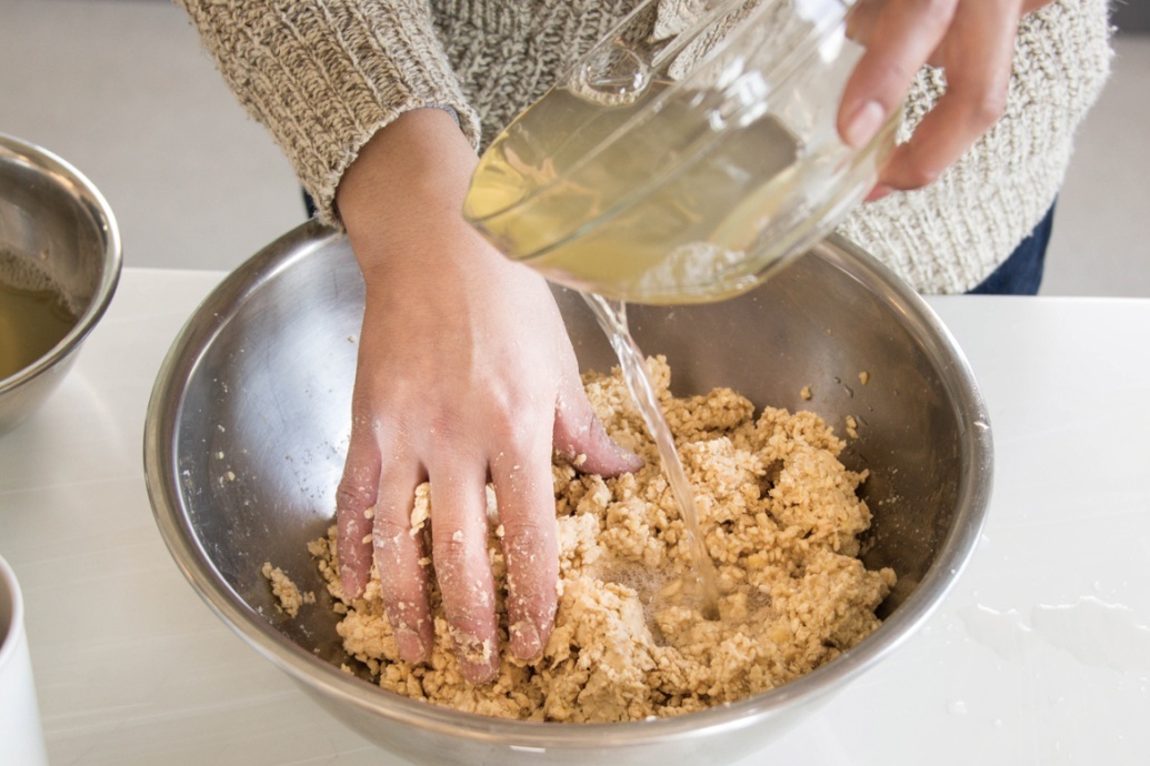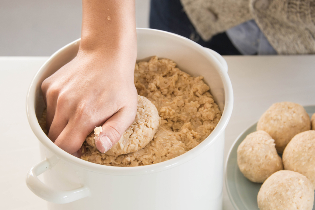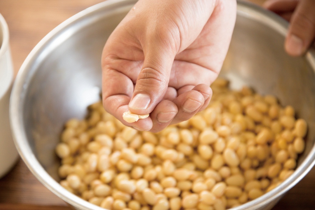 つぶした大豆をボウルにとり出し、人肌程度に冷めたら①の塩きり麹を少し混ぜてこねる。両手に体重をかけるようにして、しっかり捏ねること。