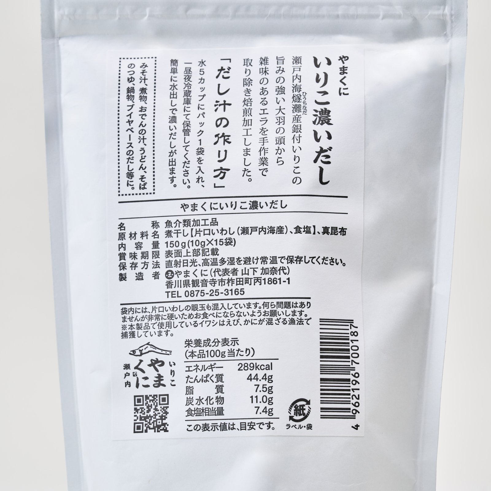 化学調味料・保存料は一切使用せず、いりこは、瀬戸内海・燧灘(ひうちなだ)産の希少な「銀付いりこ」を使用。全体のわずか0.5%ほどしか獲れない貴重なものの中から、さらに身の大きなものだけを厳選しています。